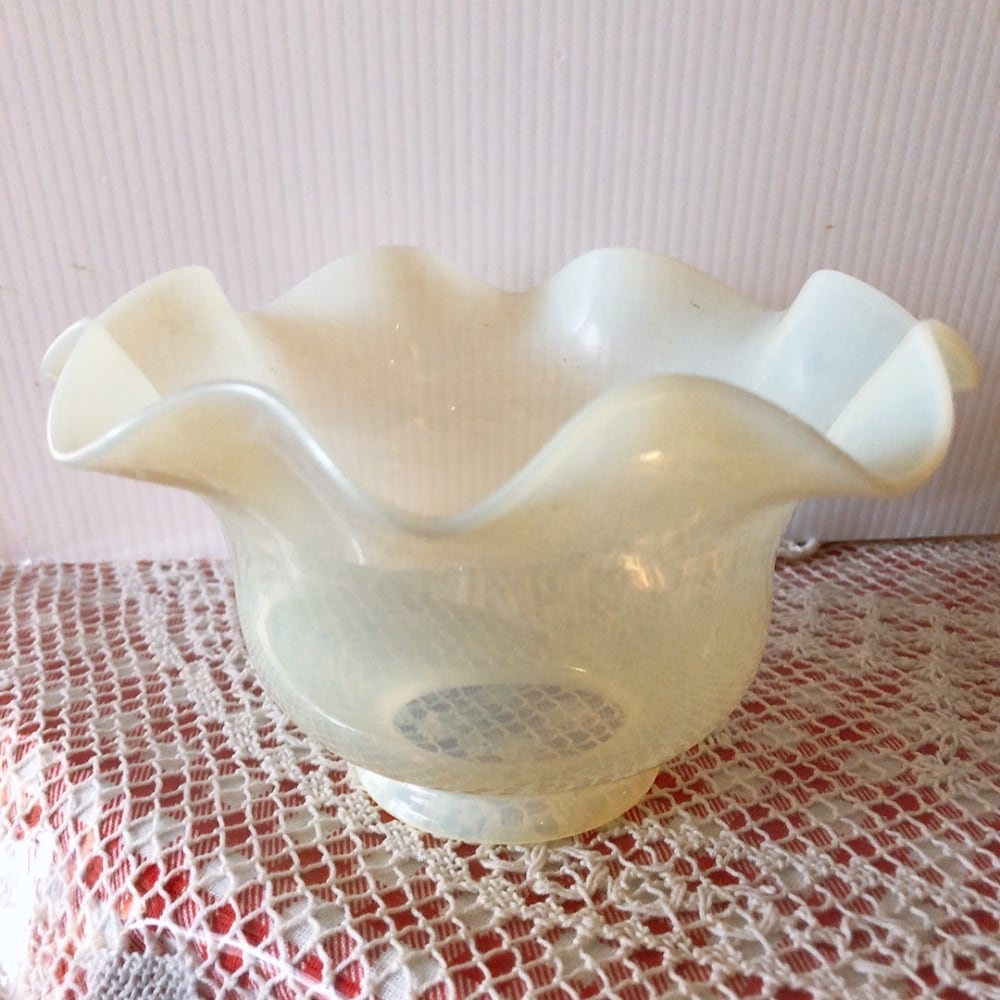 エレガントなアンティークヴァセリンシェードは、美しいヴァセリン色が魅力で、光が透過することで独自の輝きを放ちます。どのインテリアスタイルにもフィットし、リビングやダイニング、寝室など、様々な空間での使用に最適なアイテムです。
